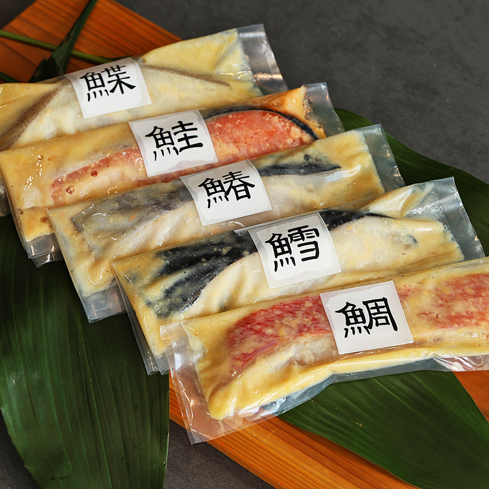 | 内容量 | サワラ味噌漬け×1切 サケ味噌漬け×1切 カラスガレイ味噌漬け×1切 金目鯛味噌漬け×1切 タラ味噌漬け×1切 |