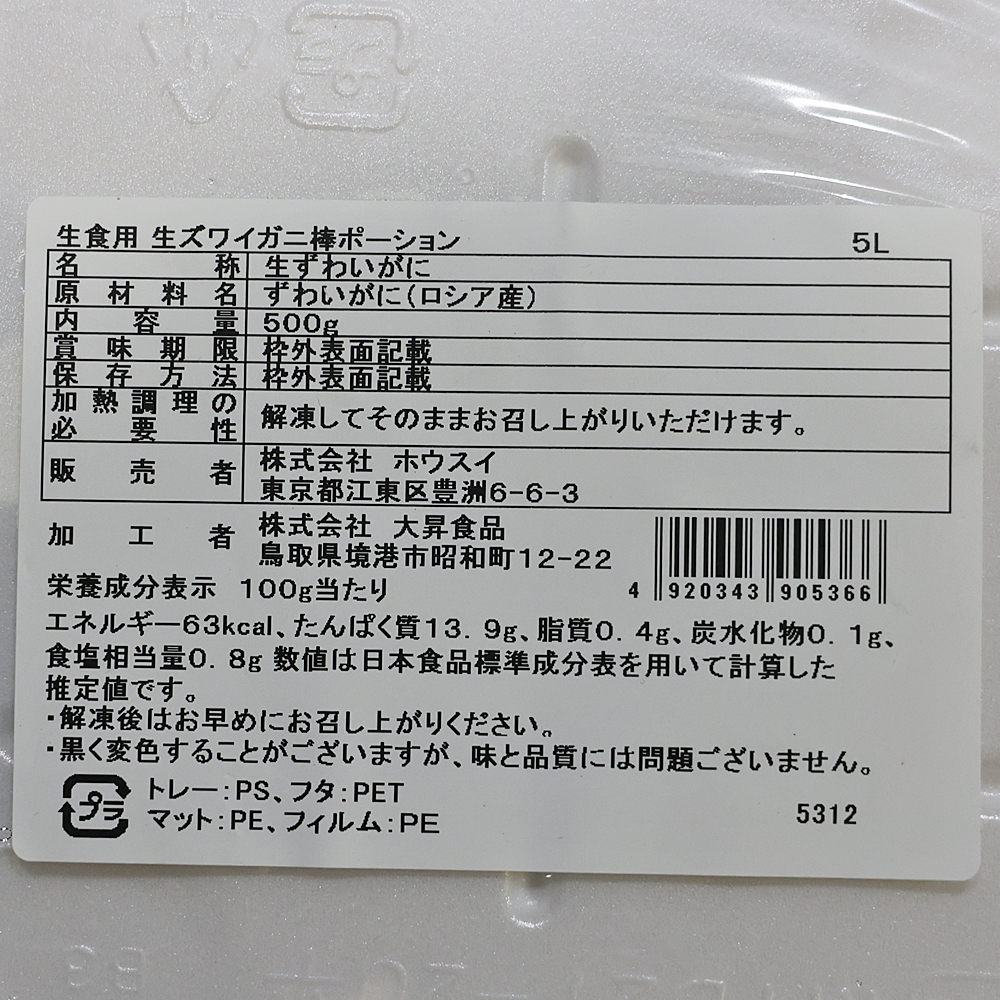 | 内容量 | 冷凍生ずわいがに(生食用)×500g | ||